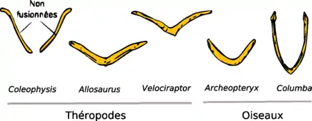 Приблизительная эволюция вилочки выглядит так (целофиз — аллозавр — велоцираптор — археоптерикс — голубь):