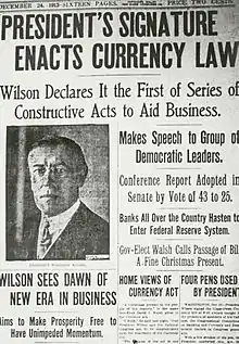 В течение первого президентского срока Вудро Вильсон в рамках политики «Новой свободы» проводил экономические реформы — создание федеральной резервной системы, банковскую реформу, антимонопольную реформу[7], во внешней политике занимал нейтральную позицию, стараясь удержать страну от вступления в Первую мировую войну.