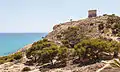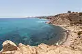 Небольшая бухта с крупной галькой, очень живописными остатками дозорной башни и площадкой для пикника в левой части.
