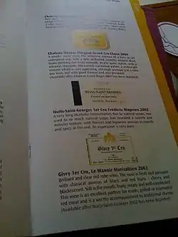 - Винная карта состоит из трёх разделов, исходя из последовательности подачи алкоголя в ресторане: аперитивы, вина (с разделением по месту производства и цвету), дижестивы.