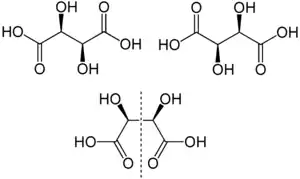 Известны три стереоизомерные формы винной кислоты: D-(−)-энантиомер (слева вверху), L-(+)-энантиомер (справа вверху) и мезо-форма (мезовинная кислота):