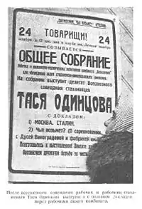 Итак, 24 ноября 1935 года родниковские ткачихи Тася Одинцова, Ирина Лапшина и Цыбина все же обгоняют вичужан и устанавливают «новый мировой рекорд» — обслуживание 216 станков. 25 ноября Тася Одинцова посылает телеграмму Сталину с сообщением о достижении. «Еще раз заверяю вас, товарищ Сталин, что от Дуси Виноградовой я не отстану!» — закончила телеграмму Тася.