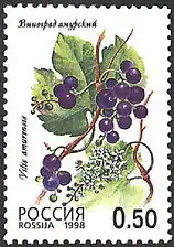 Слева направо: Амурский виноград в пору цветения (июнь). Цветок амурского винограда. Плоды амурского винограда. Амурский виноград на даче. Марка Почты России, 1998 год. | ||||||||||