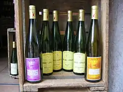 В Эльзасе производится 1,15 млн гектолитров вина в год (около 150 млн бутылок), главным образом, белые вина (90 % всей продукции)[41], и, в меньшей степени, красные, розовые и игристые. Производятся вина таких контролируемых наименований, как «Эльзас» с названием сорта винограда, из которого оно было изготовлено[42], «Эльзас Гран Крю», «Эдельцвикер», «Креман д’Эльзас».[43] Все эльзасские вина должны разливаться в месте производства по особым бутылкам с длинным горлышком («эльзасская флейта»)[41].