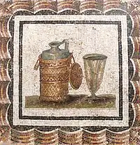 Летом вино охлаждали льдом из специальных погребов или в амфорах с двойными стенками, в которые заливалась вода для охлаждения; зимой вино часто подогревали в сосудах, похожих на самовар[4]. Вина разливали не сразу из амфоры в бокал или чашу, а перед подачей пропускали через бронзовое сито, чтобы очистить напиток от примесей и специй.