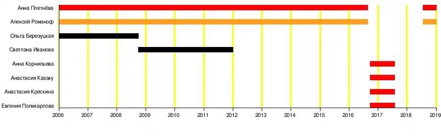 Евгения Поликарпова Анна Корнильева Анастасия Крескина Анастасия Казаку (все 2016—2017) Мия (2006—2008) Светлана Иванова (2008—2011) |