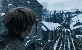 Джейме Ланнистер (Николай Костер-Вальдау) прибывает в Винтерфелл и встречает Брана во дворе замка, впервые видя его с того времени как вытолкнул Брана из окна башни.
