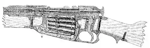 Во-вторых, что ещё важнее, после опустошения магазина требовалось его весьма длительное наполнение, осуществлявшееся в тогдашних конструкциях по одному патрону, чем существенно снижалась практическая скорострельность. Это делало проблематичным использование ранних магазинных винтовок в полевых сражениях, — хотя в определённых ситуациях, например, при обороне укреплённых позиций, когда стрелок имел возможность относительно спокойно перезарядить своё оружие, они, безусловно, имели большие преимущества.