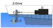 - Двигатель расположен внутри судна, его вал входит в колонку горизонтально и с помощью двух угловых зубчатых передач и промежуточного вертикального вала передается на вал гребного винта. Такая схема в мировом судостроении называется англ. Z-drive.