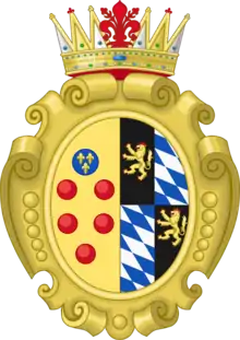Герб Виоланты Беатрисы основан на гербе её мужа Фердинандо Медичи, объединённого с гербом её отца Фердинанда Марии, курфюрста Баварии. Щит увенчан герцогской короной. Справа герб дома Медичи: в золотом поле шесть шаров, верхний лазоревый шар обременён тремя золотыми лилиями, остальные шары червлёные[31][32]. Слева герб курфюрстов Баварии: в 1-й и 4-й частях косое веретенообразное деление на серебро и лазурь [Виттельсбахи]; во 2-й и 3-й частях в чёрном поле золотой, коронованный и вооружённый червлёный восстающий лев [Курпфальц].