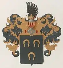 Описание герба: В чёрном поле три золотые подковы (2:1). Щит увенчан дворянскими шлемом и короной. Нашлемник: чёрное орлиное крыло. Намёт чёрный с золотом. |