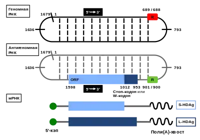 Вирион HDV содержит кольцевой геном, представленный РНК отрицательной полярности, причём вторичная структура этой РНК содержит двуцепочечные участки[18]. При размножении вируса в инфицированной клетке можно обнаружить две другие главные вирусные РНК: молекулу, комплементарную геномной (антигеномная РНК, или антигено́м), и мРНК HDV. Размер генома HDV составляет всего лишь 1672—1697 нуклеотидов, что делает его мельчайшим из всех известных вирусов млекопитающих и сближает с вироидами растений. Он имеет высокий GC-состав (60 %), а процент внутримолекулярного спаривания оснований достигает 74 %, что позволяет ему сворачиваться в палочковидную структуру. Такие структуры в условиях in vitro устойчивы к разрезанию ферментом Dicer[7]. Заражённая клетка может содержать около 300 000 молекул генома HDV, которые распределены между ядром и цитоплазмой, что свидетельствует о высоких темпах репликации. Антигеномная РНК HDV представляет собой промежуточное соединение в цикле репликации, комплементарна геномной РНК (и, следовательно, имеет положительную полярность) и содержит последовательность, кодирующую HDAg. Её количество в 5—22 раза меньше, чем геномной РНК, она встречается исключительно в ядре и потому не упаковывается в вирионы. Белки HDV транслируются со специфической мРНК длиной 800 нуклеотидов, которая транскрибируется ДНК-зависимой РНК-полимеразой II клетки-хозяина и проходит те же этапы созревания (в том числе кэпирование и полиаденилирование), что и клеточные мРНК[9].