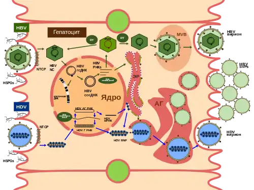 HBV проникает в клетку путём клатрин-зависимого эндоцитоза и проходит через ранние и поздние эндосомы, причём закисление и протеазная активность на него не действуют. Для HDV доказательств этому нет, хотя было показано, что L-HDAg может выступать адаптерным белком при взаимодействии с клатрином. Этапы ядерного транспорта рибонуклеопротеина HDV после проникновения в клетку и лишения генома оболочки изучены не до конца. Перемещение рибонуклеопротеина HDV между цитоплазмой и ядром может происходить при участии HDAg и его взаимодействии с импортинами[9]. Нуклекапсид переносится в ядро благодаря сигналу ядерной локализации, имеющемуся у дельта-антигена[25].