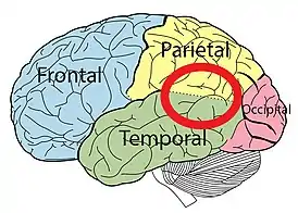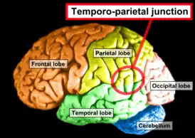 ![]() Головной мозг, вид сбоку. Височно-теменной узел указывается красным кругом | |