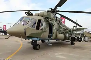 Видны ультрафиолетовые пеленгаторы факта пуска ракет и станции оптико-электронного подавления на законцовках держателей внешней подвески, а также устройства выброса пассивных помех на борту вертолёта (ближе к хвостовой балке).