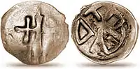 Небольшие по размерам монетки Витовта (пенязь типа «Колюмны» — наконечник стрелы с крестом) чеканились приблизительно до 1401 г. на монетных дворах в Луцке и Вильно.