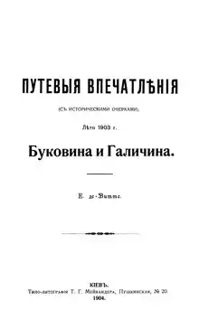 - Буковина и Галичина. Путевые впечатления (с историческими очерками). Лето 1903 г. Киев, 1904