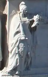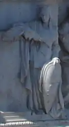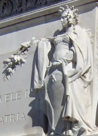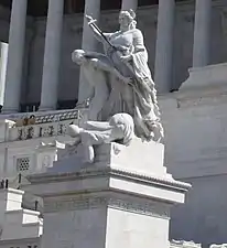 - Пиза. Женская фигура во фригийском колпаке, держащая в левой руке лавровую ветвь над щитком "Per legge del 16 maggio 1878" [по закону от 16 мая 1878 г.; имеется в виду указ о строительстве Витториано].