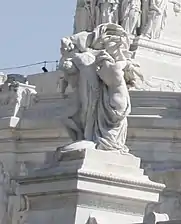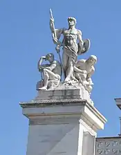 - Лацио. Фигурка Виктории в руке этой фигуры символизирует ответственность этой области, где находится Рим, за сохранение и защиту единства Италии, завоеванного в ходе Рисорджименто. Скульптор — Адольфо Пантарези.