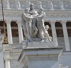 Вокруг памятника стоят шесть статуй высотой по 6 м, олицетворяющих «Ценности итальянцев» (I Valori degli italiani). Перед памятником — две отдельных бронзовых: слева — Мысль (Il Pensiero) работы Джулио Монтеверде, справа — Действие (L’Azione) работы Франческо Джераче. Остальные четыре статуи — из боттичинского мрамора: слева ближе к центру — Согласие (La Concordia) работы Лудовико Польяги, дальше от центра — Сила (La Forza) работы Аугусто Ривальта; симметрично им справа расположены Жертвенность (Il Sacrificio) работы Леонардо Бистольфи (ближе к центру) и Право (Il Diritto) работы Этторе Хименеса (дальше от центра).
