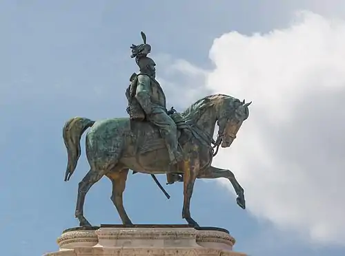 На террасе выше и позади Алтаря отечества возвышается конный памятник королю Виктору Эммануилу II — композиционный центр всего ансамбля и единственная его статуя, не имеющая аллегорического характера. Статуя была отлита из бронзовых пушек Королевской армии. На право ее создать был также объявлен конкурс, в котором в 1889 г. победил скульптор Энрико Кьярадиа. Он начал работу над ней, но в 1901 г. умер, и статую закончил Эмилио Галлори. В брюхе бронзового коня есть полость, где вмещается до двадцати человек и где до установки статуи на постамент (1910 г.) строители и гости официально устроили пирушку. Высота статуи — 12 м (с пьедесталом — 24,8 м), длина — 10 м, вес 50 т.