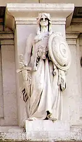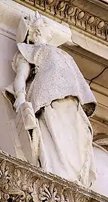 - Милан. На щите, который держит эта фигура, — бисцион, герб Висконти, и крест миланской коммуны, какой возили на повозке-карроччо.
