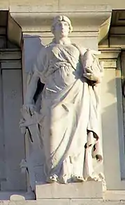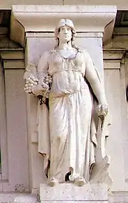 - Апулия. Фигура в похожем одеянии, с распущенными волосами, с гроздью винограда в одной руке и опирающаяся другою на плуг, символизирующий плодородие Апулийской низменности. Скульптор — Франческо Пифферетти.