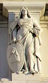 - Венеция. Фигура в короне и облачении дожа. В правой руке держит щит со львом святого Марка в позе in molèca, то есть краба.