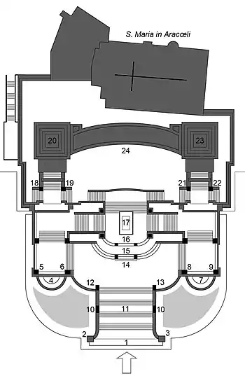24. Портик с колоннадой; на фризе — статуи, символизирующие области Италии; на террасе под стилобатом — алтари с названиями «освобожденных» городов