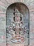 | Схожий образ Вишварупы находится в храме Варахи (Уттар-Прадеш, 24°29′26″ с. ш. 78°19′14″ в. д.). Изображение датируется IX веком и представляет развитую иконографию Вишварупы. Божество имеет шесть рук и три головы: Хаягривы посередине и Нарасимхи и Варахи по сторонам. Вероятно, существовала и четвёртая голова, которая располагалась выше Хаягривы. Вокруг Хаягривы находится ореол из человеческих голов. Из фигур исходят языки пламени, что символизирует ослепительное сияние, исходящее от Вишварупы, подобно бушующему огню[12]. | |