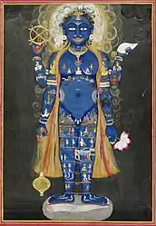 Альтернативная иконография Вишварупы, развивающаяся с XVII века, отошла от множественности форм Вишну и перешла к изображению его универсумом, в котором пребывают миры и существа. В каждой части тела Вишну находятся миры: от стоп, где располагаются демонический мир со змеями и злыми духами, до груди и головы с божественным миром, полным богов. Его глазами являются Солнце и Луна, в руках он держит четыре атрибута (шанкху, Сударшану, Каумодаки и цветок лотоса). |