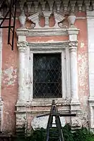 Окно Владимирской холодной церкви: рваный фронтон, карниз, полуколонки и картуш