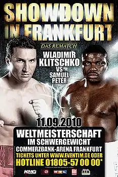 Этот поединок стал вторым для боксёров. Первый бой состоялся 10 апреля 2004 года в Атлантик-Сити (Нью-Джерси, США).Владимир Кличко доминировал на протяжении всего поединка, работая джебами и срывая атаки противника, но Сэмюэлу Питеру удалось трижды отправить его в нокдаун. Несмотря на падения, победу в поединке единогласным судейским решением одержал Владимир Кличко. Все три судьи отдали победу Кличко со счётом 114—111.