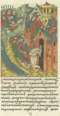 ![]() Владимир Рюрикович садится в Киеве после битвы на Калке | |