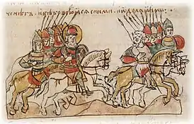 По Яхъе соединённые силы русов и греков разгромили войска Фоки под Хрисополем[52] в конце 988 года, а в апреле 989 года союзники в сражении под Абидосом[53] покончили с Вардой Фокой. Арабский историк начала XIII века Ибн аль-Асир также сообщил о крещении русов в версии, близкой к Яхъе Антиохийскому, но отнеся событие к 986 году, причём царь русов в его изложении сначала крестился, потом женился и тогда пошёл воевать с Вардой Фокой.