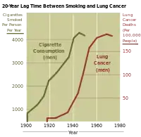 В первой трети XX века медики начали сообщать о негативном влиянии табака. Так, в 1924 году некоторые американские врачи признали курение «одной из очень важных причин, почему меньше мужчин, чем женщин, достигают старости». К этому моменту исследователям было уже известно, что табак влечёт функциональные расстройства ряда органов, в особенности сердца[30]. Четыре года спустя врачи предположили, что пассивное курение связано с развитием рака лёгких у женщин. Но клинические данные о связи неинфекционных заболеваний и табакокурения стали активно накапливаться с 1930-х годов. В начале десятилетия кёльнские врачи выявили статистическую взаимосвязь между курением и раком лёгких. В 1938 году журнал Science опубликовал исследование, согласно которому только 45 % курильщиков доживают до 60 лет[20][31]. Довоенные исследования в США также свидетельствовали, что табак негативно сказывается на продолжительность жизни. Но из-за недостаточной выборки медики нуждались в дополнительных подтверждениях[32][20].