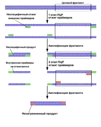 При этом вероятность отжига праймеров на другие продукты первого этапа крайне низка и в большинстве случаев амплифицируется лишь целевой фрагмент ДНК[2][3].
