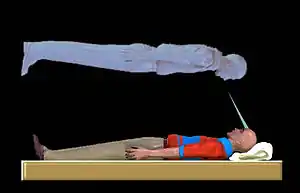 - ощущение разделения с неподвижно лежащим физическим телом и выхода из физического тела в «другом» теле;