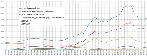 | Дата | Общий внешний долг | Долг компаний | Долг банков (кроме ЦБ РФ) | Федеральный долг (без СССР, ЦБ и субъектов РФ) | Долг Центрального банка РФ | Долг субъектов РФ | Долг СССР |