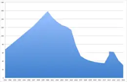 На графике и в таблице показана динамика внешнего долга Российской Федерации в миллионах долларов США.[12] Федеральный долг, долг СССР, долг Центрального Банка России и долги субъектов России составляют государственный долг России.