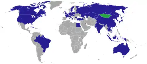 Страны, в которых находятся монгольские посольства. Светло-голубой цвет - страны, имеющие дипотношения, интересы которых представляют посольства в других странах.