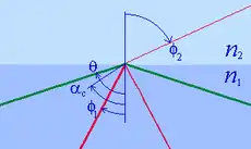 Рассмотрим внутреннее отражение на примере двух монохроматических лучей, падающих на границу раздела двух сред. Лучи падают из зоны более плотной среды (обозначена более тёмным голубым цветом) с показателем преломления на границу с менее плотной средой (обозначена светло-голубым цветом) с показателем преломления .