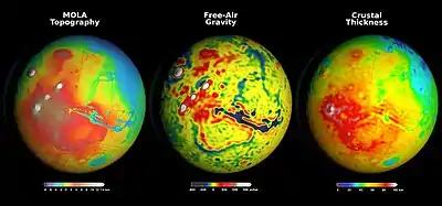 - Кора толщиной в среднем 50 км (максимальная оценка — не более 125 км)[9] и составляющая по объёму до 4,4 % всего Марса. Для строения коры свойственна дихотомия между андезитовой северной и базальтовой южной частью, не полностью совпадающая, однако, с глобальной геологической дихотомией полушарий. Более тонкая кора — под ударными бассейнами и вдоль долин Маринера, а крупные вулканические области (Фарсида, Элизий) характеризуются более толстой корой за счёт продуктов вулканической активности[17]. Некоторые теории не исключают, что кора состоит из непористых базальтовых пород и имеет толщину порядка 100 км и даже более[18], однако в совокупности геофизические и геохимические свидетельства всё же говорят скорее в пользу слоистой тонкой коры с небазальтовыми и/или пористыми материалами в составе[16]. Средняя плотность коры — порядка 3100 кг/м3[18].