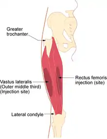 - Дельтовидная мышца (лат. musculus deltoideus). — средняя треть мышцы, не рекомендуются инъекции объёмом более 1,0 миллилитра.