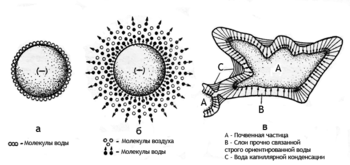 - Максимально-гигроскопическая влага адсорбируется почвой из атмосферы с относительной влажностью 95-100 %. При отрицательных температурах максимальная гигроскопическая влажность незасоленной почвы совпадает с процентным содержанием незамёрзшей воды в целом[6]. Адсорбционная способность частиц почвы зависит от их величины, формы и химического состава, причём даже на одной частице мощность слоя влаги может быть различной в зависимости от формы поверхности. При этом часть паров конденсируется на вогнутых участках, в результате чего суммарное количество воды имеет двойную природу, складываясь из адсорбированной и капиллярно-конденсированной влаги.