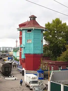 Восьмиугольная башня западным фасадом обращена к железнодорожным путям[1].