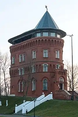 В 1912 году старая водонапорная башня была перестроена по проекту городского архитектора С. М. Жарова. Здание представляет собой трёхъярусное сооружение из красного кирпича в «неорусском» стиле, имеющее в плане форму цистерны и немного расширяющееся кверху, как крепостная башня. Украшением служат окна, в том числе сдвоенные, разной высоты в каждом ярусе, и кирпичный декор — стрельчатые арки и прямоугольные сандрики над окнами; два пояса арочных ниш, имитирующих машикули; карнизные валики, разделяющие ярусы.