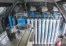 Ионный обмен[25]: Ионообменные системы используют колонки с ионообменной смолой или цеолитом для замены нежелательных ионов. Наиболее распространенным случаем является умягчение воды, состоящее в удалении ионов Ca2+ и Mg2+, заменяя их доброкачественными (мыльными) ионами Na+ или K+. Ионообменные смолы также используются для удаления токсичных ионов, таких как нитрит, свинец, ртуть, мышьяк и многие другие.