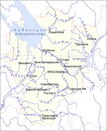 По территории Ярославской области протекает 4327 рек общей протяженностью 19 340 км. Наибольшее количество — 3696 — составляют ручьи и очень маленькие речки, длина которых не превышает 10 км. Длину от 11 до 20 км имеют 245 речек, от 21 до 50 км имеют 64 реки; от 51 до 200 км — 18 рек и, наконец, 11 относительно крупных рек области имеют длину от 101 до 150 км. Большинство из этих рек несут свои воды в главную реку — Волгу, являясь её притоками или притоками её притоков. Несколько рек впадает в озеро Неро и Плещеево, а также в реку Кострому.[1]