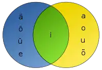 Присутствует гармония гласных: все гласные в слове могут быть или переднего ряда (e, ü, ö, ä), или непереднего (e̮, u, o, a). На гласные i и i̮ гармония не распространяется[30].